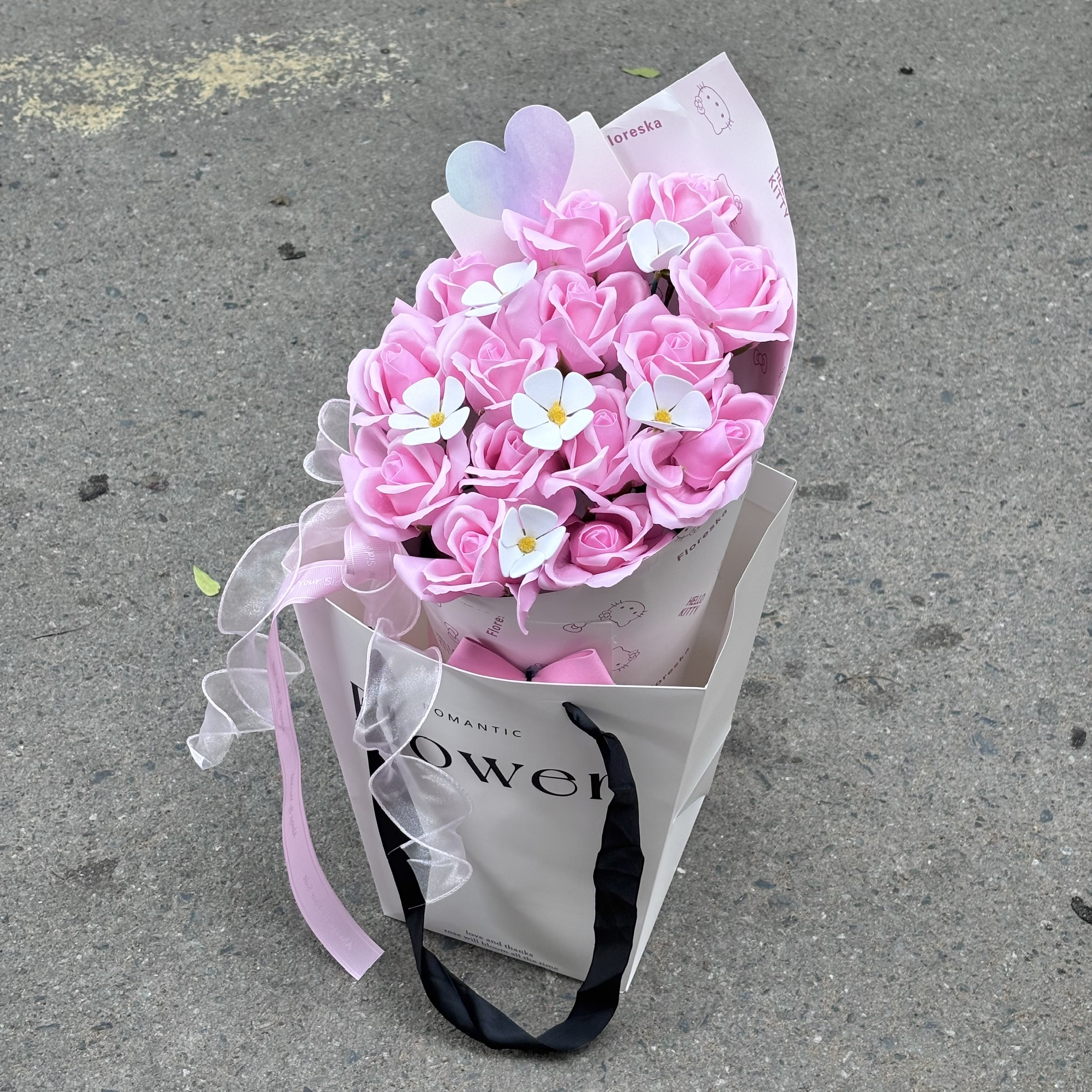 Hoa hồng sáp hồng pastel cao cấp kết hợp phụ kiện và giấy gói Hello Kitty dễ thương.