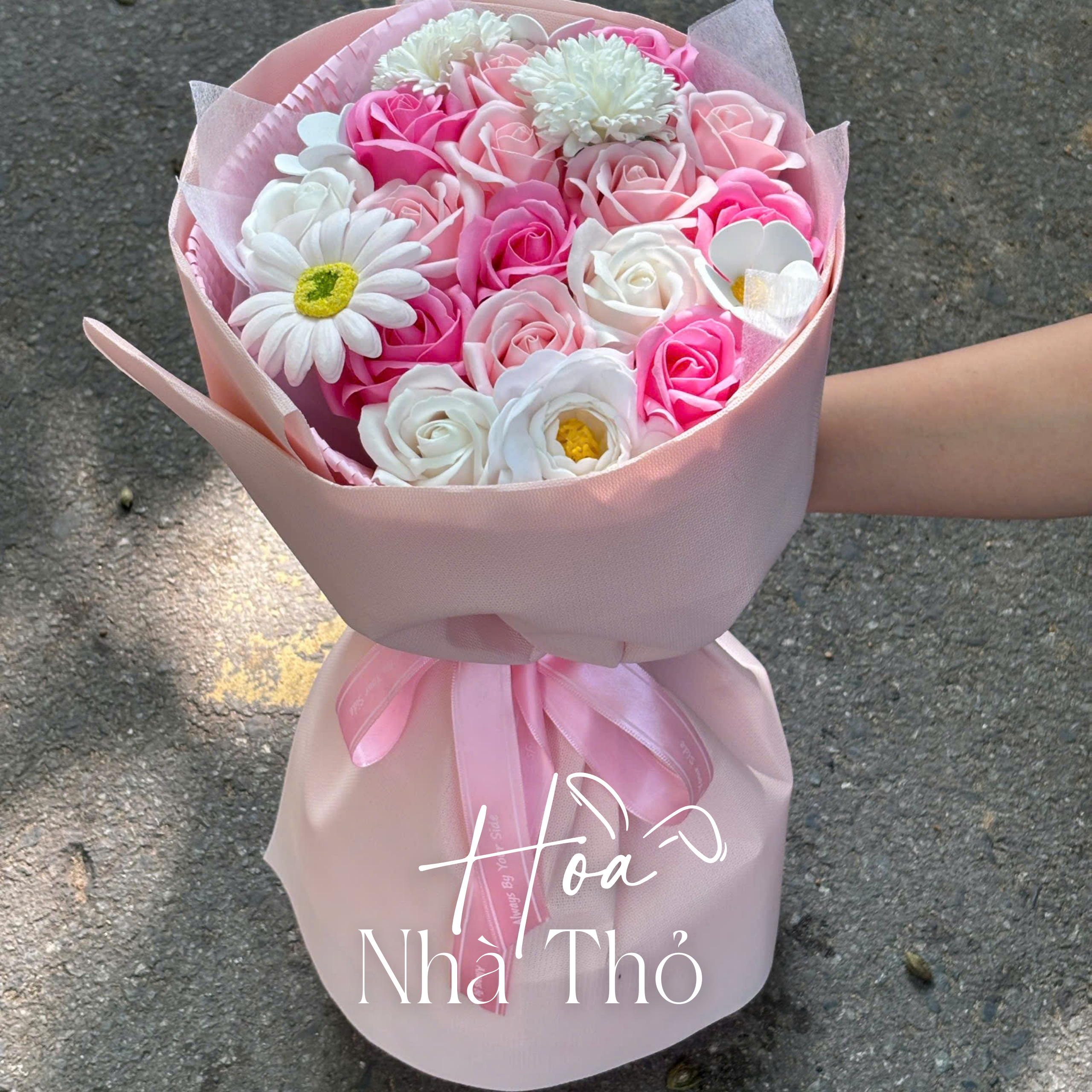 Hoa hồng sáp thơm cao cấp mix tone hồng nhạt, hồng đậm và trắng kem, điểm hoa cúc trắng xinh xắn. Kết hợp giấy voan hồng trong suốt và ruy băng satin tinh tế.